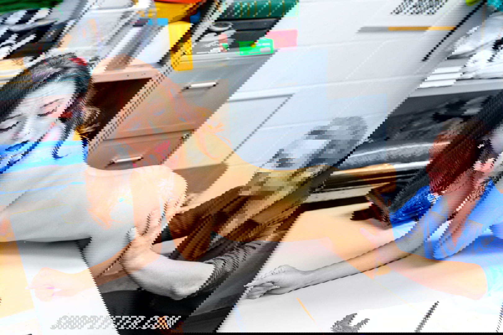 Mandy Rhea in green blazer flashes cleavage, then watches brunette Serena Hill in pink tank top suck principal's cock deep. Both sluts double-team his dick on desk, tongues swirling shafts. Serena kneels eating Mandy's spread pussy while principal pounds Serena doggy-style from behind. Straddling cunnilingus escalates to desk-top fucking, white bras and thongs ripped off. Nude tattooed Mandy on all fours licks balls as principal grips hips. Brunette teen bares ass in purple skirt, both kneel staring at throbbing cock. Intense MFF threesome builds to cumshots splattering their open mouths and faces in hot facials.